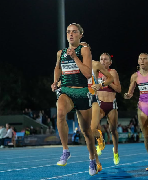 Hollingsworth, who set a world outdoor lead of 3:58.09 in Melbourne on March 5, made her decisive move with 200m remaining. Hunter Bell was unable to keep up during the final metres.