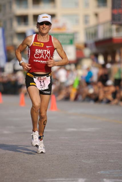 Lucy Smith: Thank you for the compliment. I have very little video coverage of me running and most of my greatest races were done before YouTube, so I don’t get to see myself running very much, but feedback like yours makes me believe I must be doing something right! I was active and started running at a very young age so I am sure that I have developed efficiency. I did work on my running technique while I was at Dalhousie University in Halifax being coached by Al Yarr—we observed my cadence and my ‘bounding stride’—and Lance (Husband and coach, Lance Watson, LifeSport) has continually monitored my training and racing biomechanics and efficiency through my career. I am a very conscious runner. I pay attention to my breathing, my forward energy and my posture. I use imagery of great runners, and try to ‘feel’ like them while I run. Running well—a many-faceted concept–has always been a very strong theme in my life.